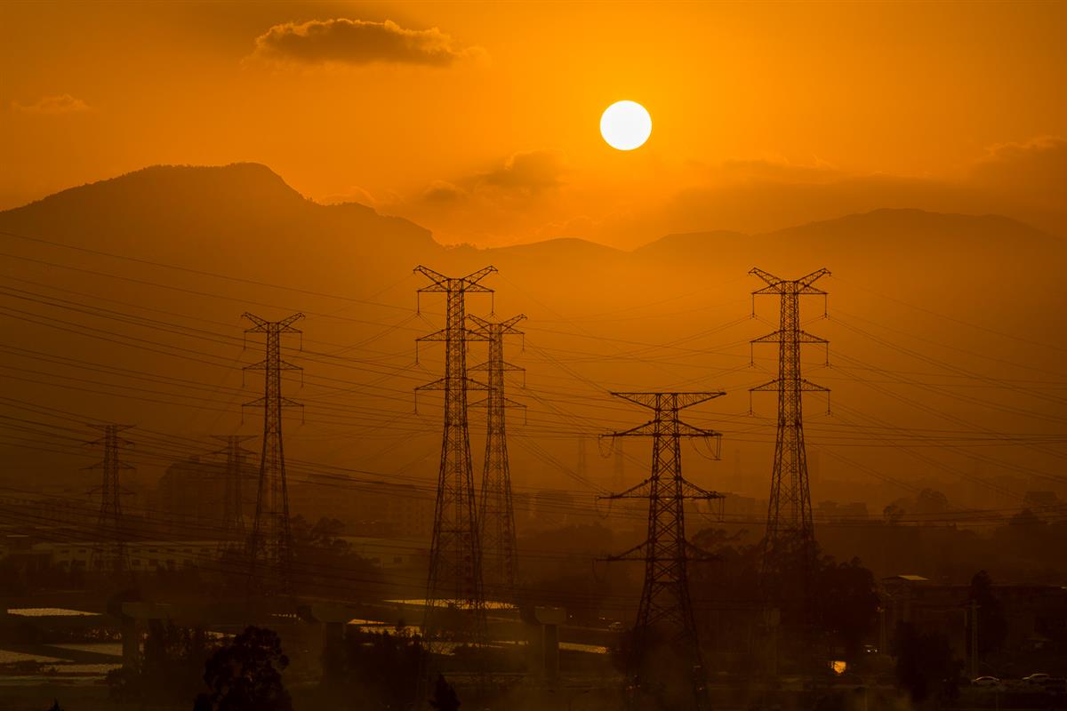 输电铁塔在夕照中如钢铁森林,银线交织成城市的能源脉络,以工业美学诠释现代城建的力量与秩序。