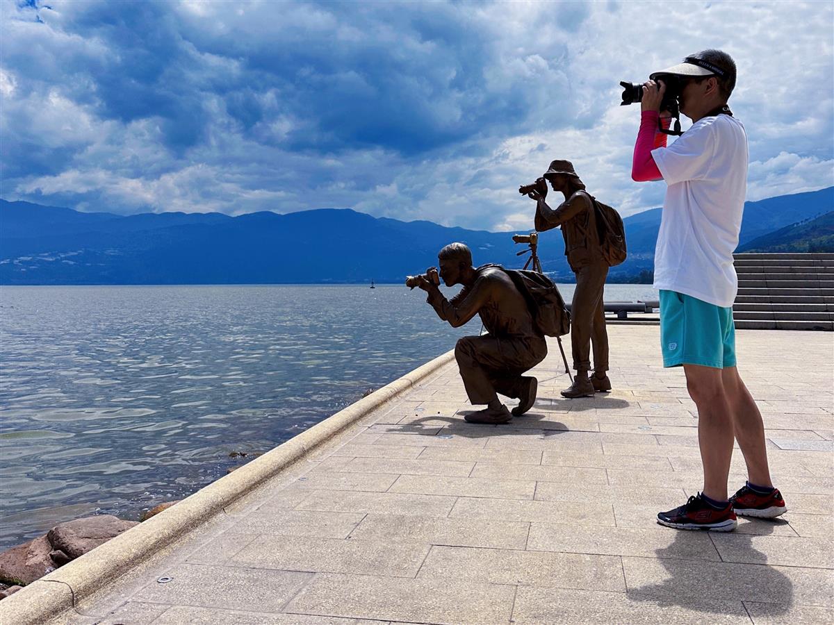 邛海边,一个摄影人正在拍摄美景,正好和旁边两个摄影的雕塑组合成有趣的画面,赶紧按下快门。