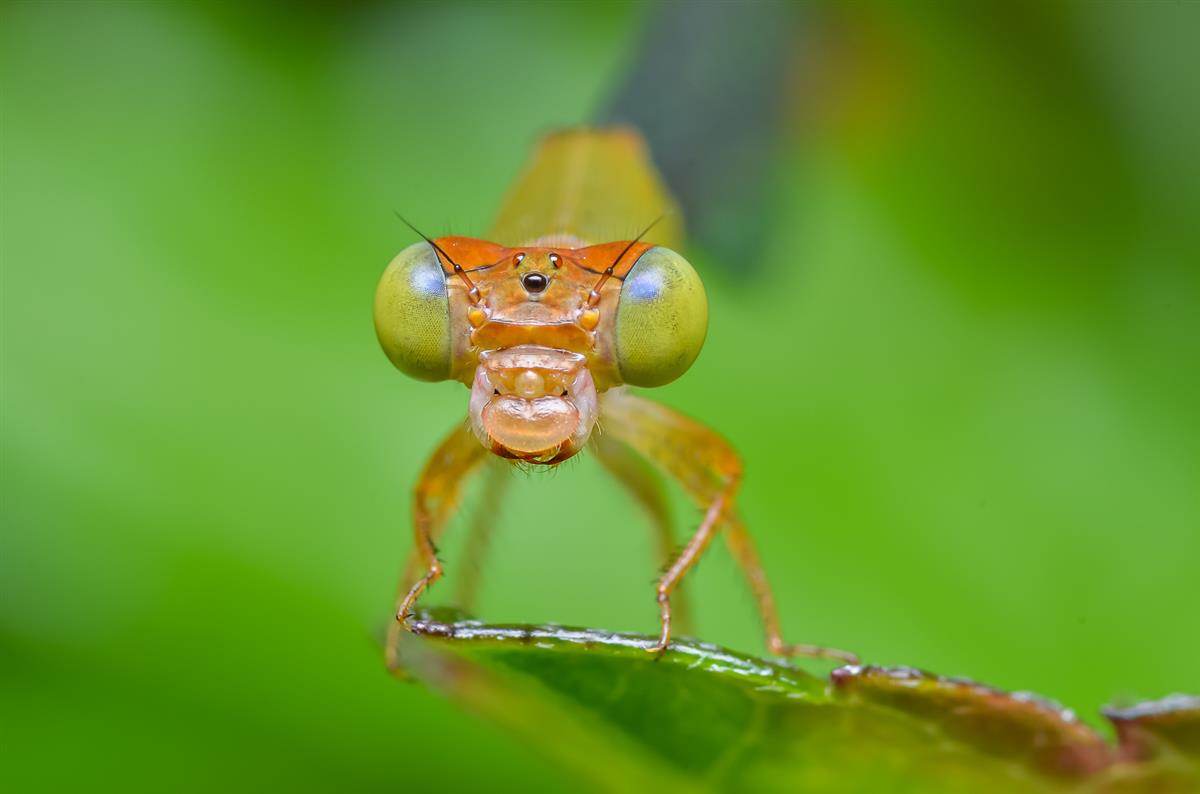豆娘轻栖于叶,大眼微探,在绿意氤氲的世界里,诉说着自然的细腻与生机。