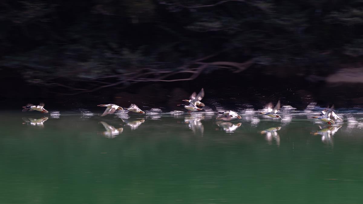流纱曳影:慢门定格秋沙鸭破水瞬间