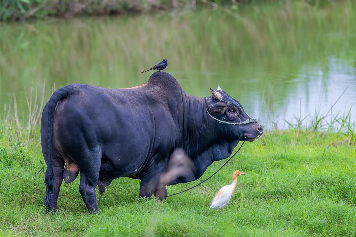黑牛静立青草地,鸟栖牛背、鹭伴身旁,绘就一幅生态和谐的田园画卷。