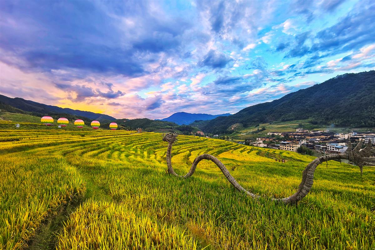 金浪翻涌,草龙蜿蜒,在霞光与青山间,绘就一幅生态与人文共生的丰收画卷。