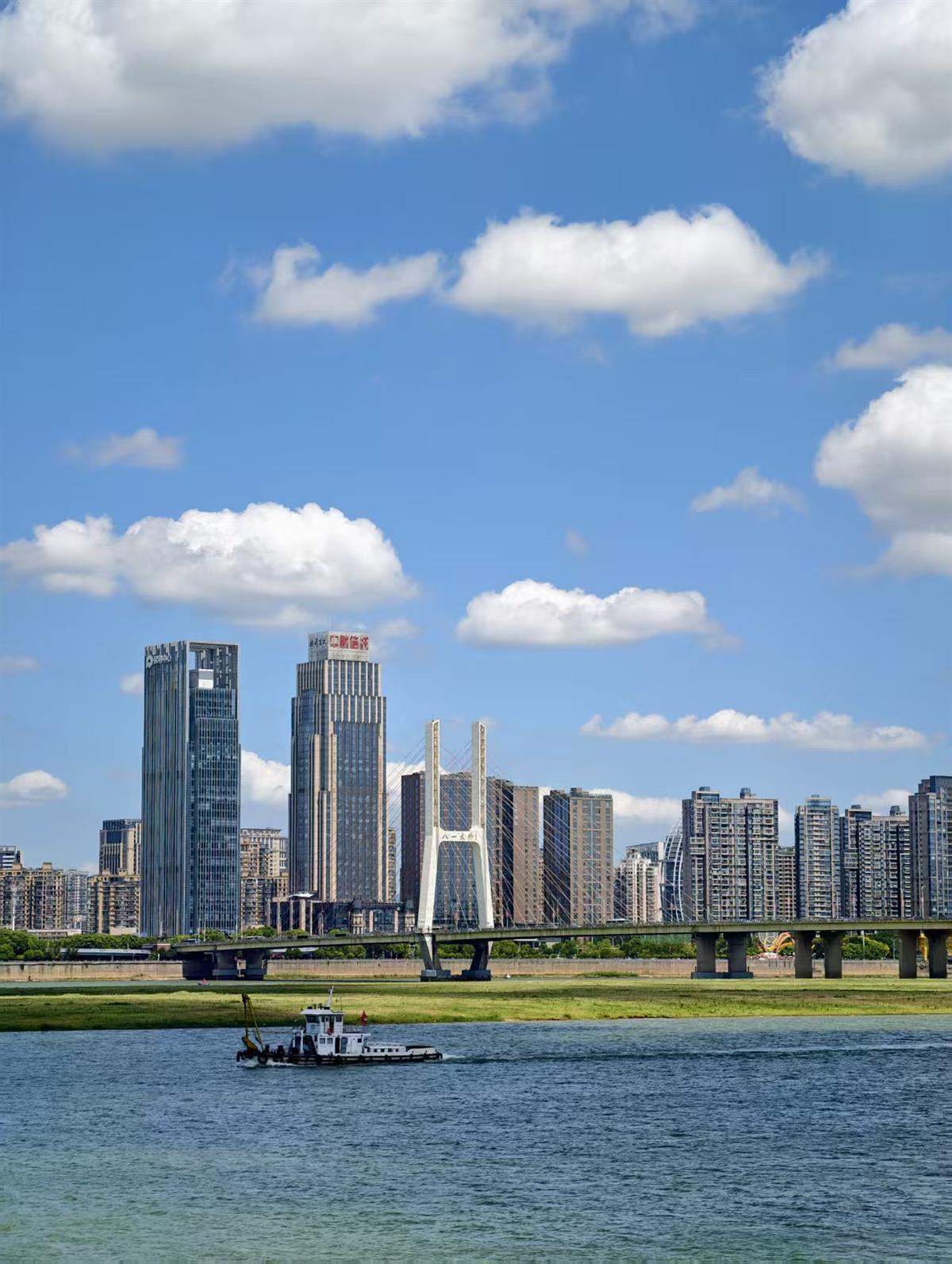 江边,现代化的高楼大厦鳞次栉比,它们以简洁流畅的线条、富有质感的外立面,彰显着城市的繁荣与发展。其中几座高耸的建筑尤为醒目,成为城市天际线的标志性存在。横跨江面的大桥,结构精巧,线条硬朗,与周边建筑相互映衬。江面上,船只划破平静的水面,为静态的城市画面注入了动态的的生机。