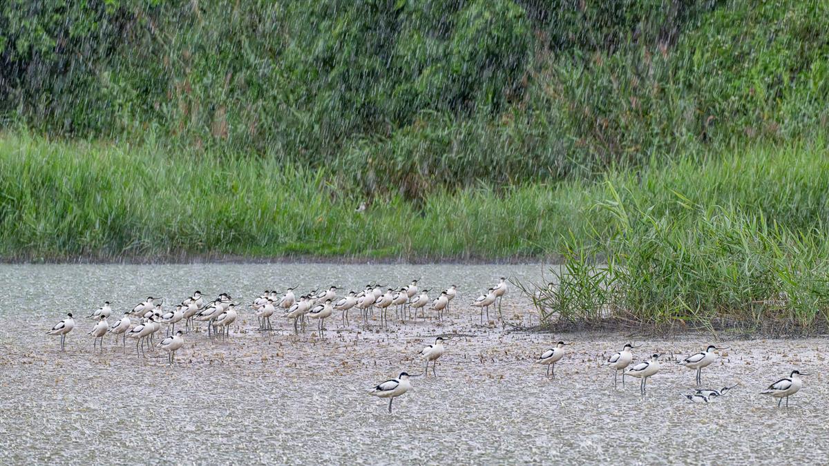 雨丝织绿幕,反嘴鹬群栖,湿地生机里,是自然生态的灵动诗篇。