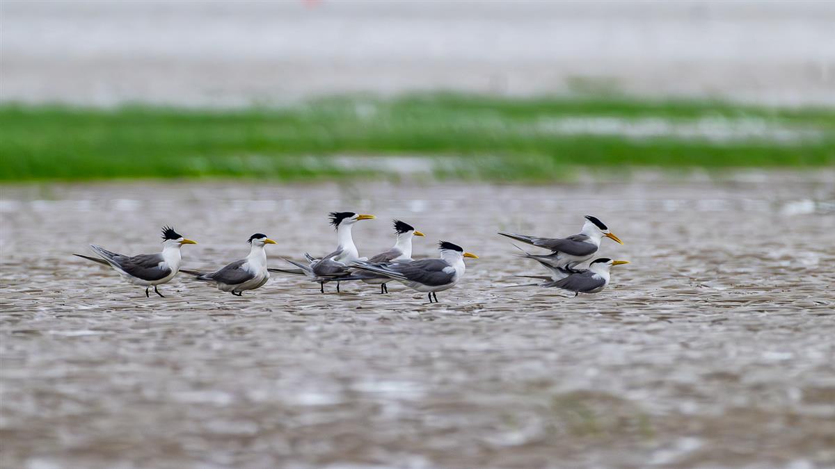 大凤头燕鸥结队踏浪,绿滩浅湾间,绘就湿地生态的灵动诗篇。