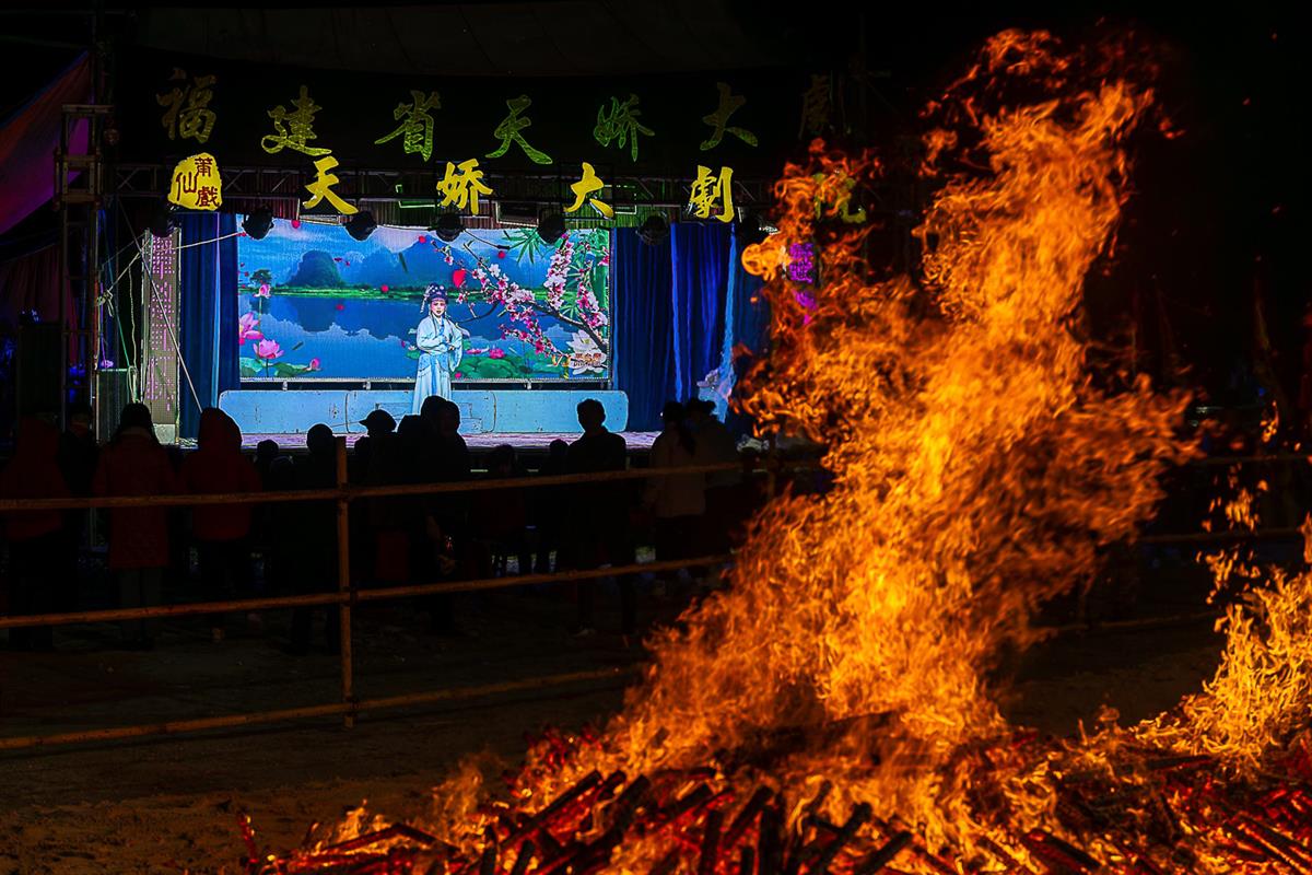 火光映亮戏台,乡音袅袅,民俗的烟火气在夜色里温暖着乡邻的日常。