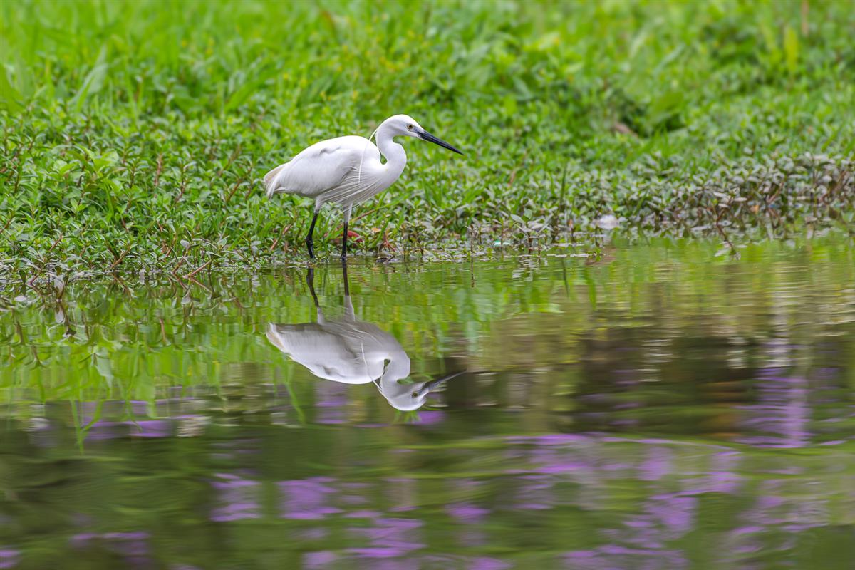 白鹭轻立溪岸,清波揽影,绿茵铺展,是自然里温柔的生态瞬间。