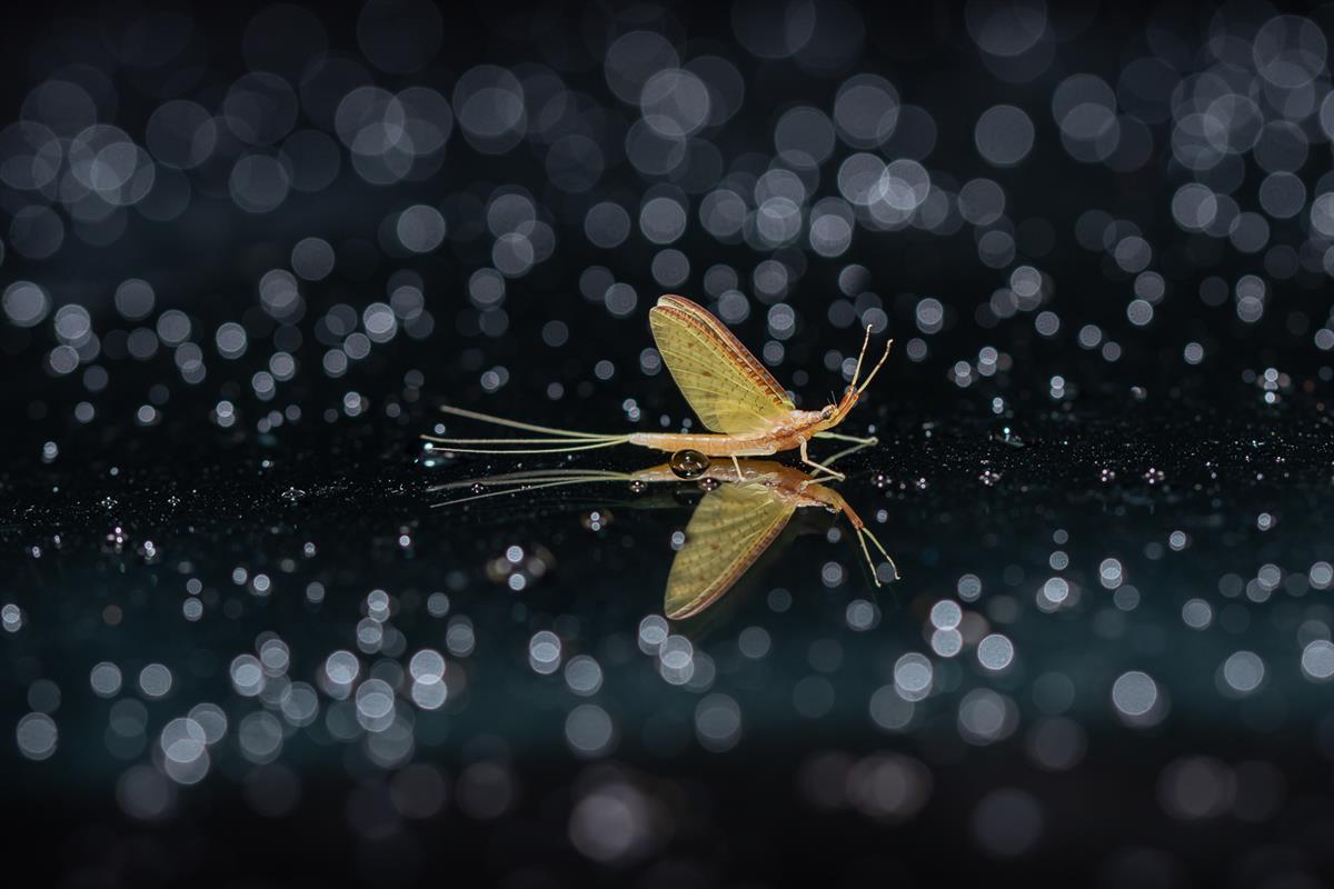 夜上福州北峰山上觅虫,夜里突然一阵急雨,雨后欣喜的发现一只蜉蝣被灯光引来落在车窗玻璃上,脑海中神往已久的一个画面一闪而过,我迅速拿起相机调好设置和灯光,主灯逆光,副灯正面补光,低角度拍摄使蜉蝣镜面成像。焦外玻璃上的点点雨滴幻化成梦幻银河,蜉蝣宛如落入银河长袖飘飘的美仙子,让人惊叹它的轻盈、飘逸、空灵之美!