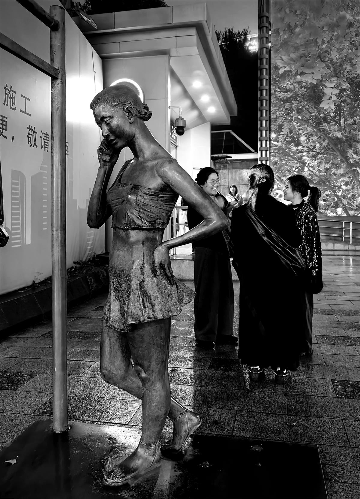 上海市淮海中路陕西路地铁站口一尊“打电话的少女”铜雕塑吸引了众多上海市民的关注,曾经几度被锯断窃走又几度重铸恢复。