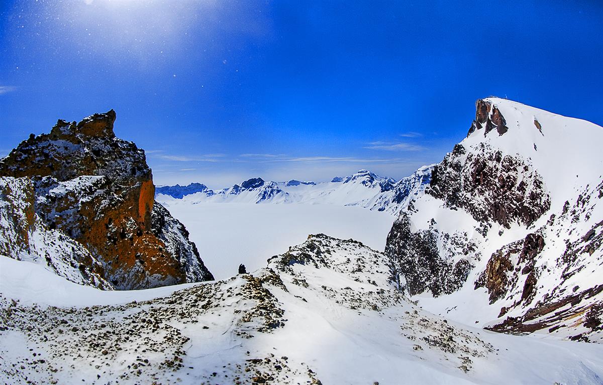 这张照片两侧的火山锥体岩壁裸露,呈现出冷峻的红褐色与深黑色,被白雪勾勒出硬朗的轮廓。左侧的山体尤为突出,橙红色的岩壁在白雪的映衬下,像被火焰灼烧过的雕塑,充满了原始的力量感。