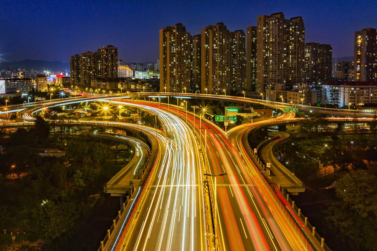 尤溪洲大桥的多层立交在夜色中舒展,车流如织,绘就一幅现代都市的流动城建画卷。