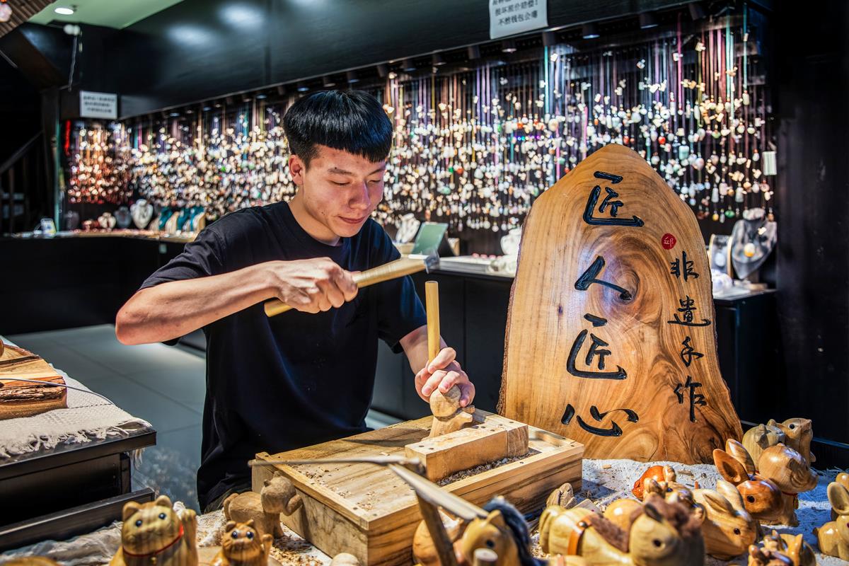 暖光里,匠人执锤专注雕琢木件,周围萌趣木雕与“匠人匠心”木牌相映,在琳琅饰品的背景下,把非遗手作的温度与坚守细细剖给人看。