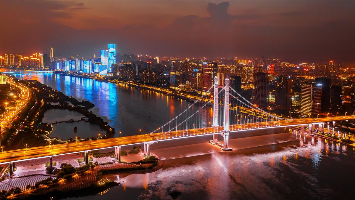 鼓山大桥如金虹卧波,悬索为弦,在闽江夜色中勾勒出福州城建的璀璨画卷。