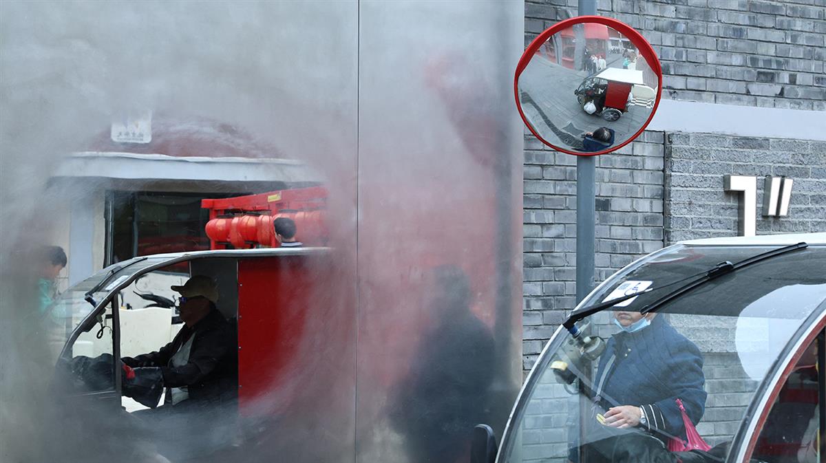 这张照片体现出镜内与镜外的两个世界,一边是传统的三轮车,一边是现代的凸凸镜里的三轮车辆形成呼应,像老北京胡同里的时空切片。这张照片定格了北京胡同转角处的一个日常瞬间,充满了新旧交织的烟火气。