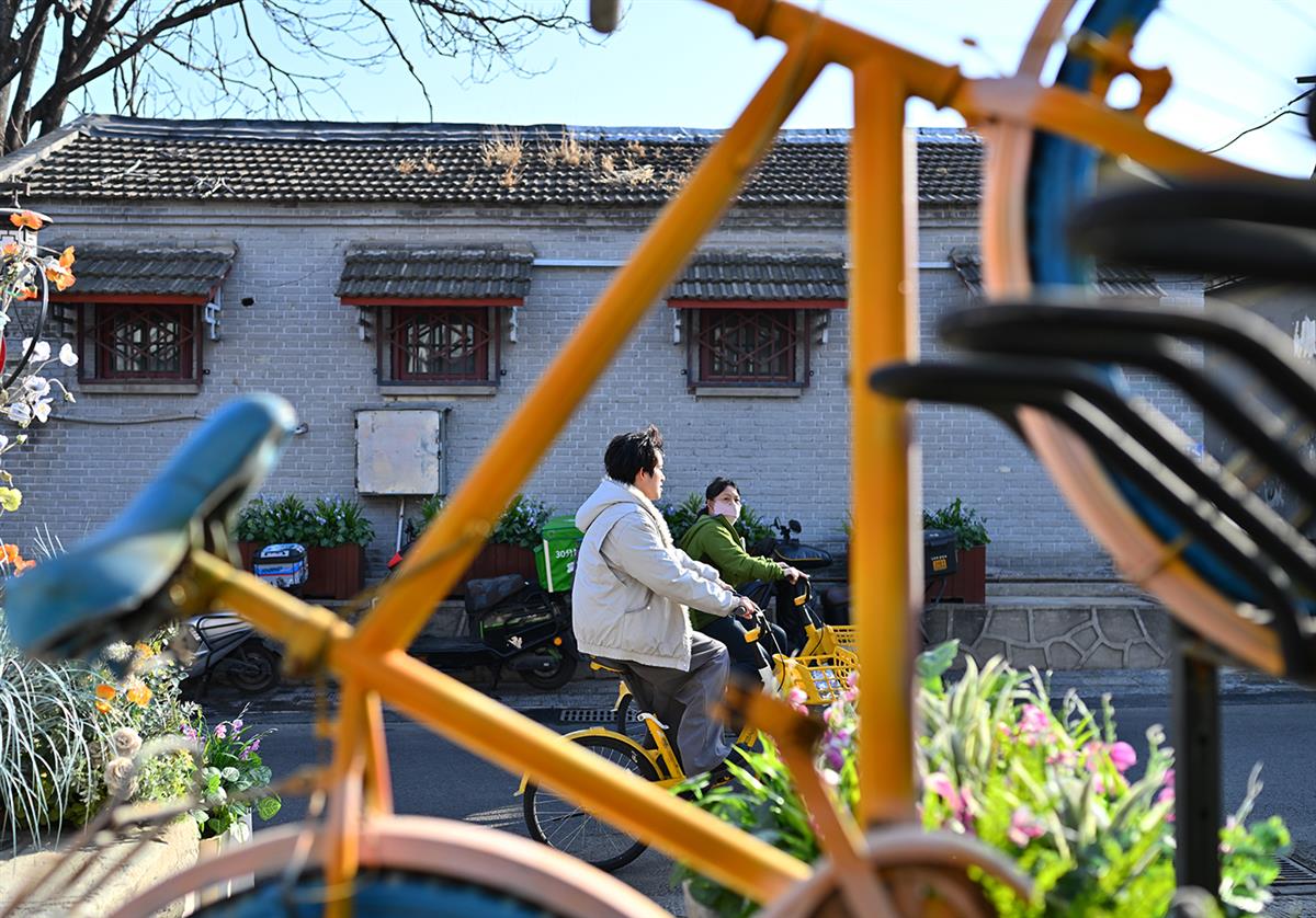 这张照片聚焦于两位骑行者的背影,用最朴素的方式,捕捉胡同里最常见的生活节奏。前景的黄色车架比作取景器,暗示这只是无数胡同日常中的一帧,背景是一整面青灰色的砖墙,上面带有红色窗棂的小窗,窗下摆放着几盆绿植,为冷峻的墙面增添了一抹生机。照片通过一个巧妙的画框构图,定格了北京胡同里一个充满烟火气的日常瞬间。