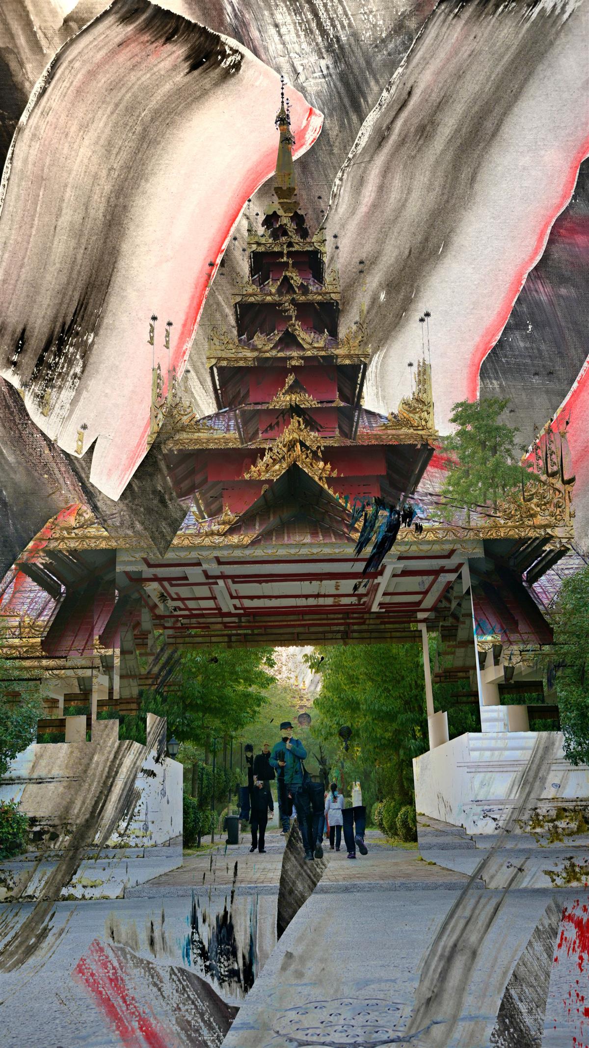 泰国风格佛殿的华丽门楼,多层尖顶式建筑金碧辉煌,檐角飞翘,雕饰精美,充满东南亚宗教建筑特色。