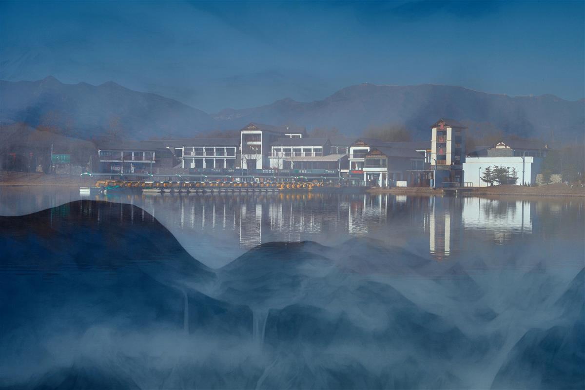 晨雾中的龙泉湖,远山与建筑倒映在如镜湖面,山峦叠影与湖光山色交融,宛如水墨长卷徐徐展开。