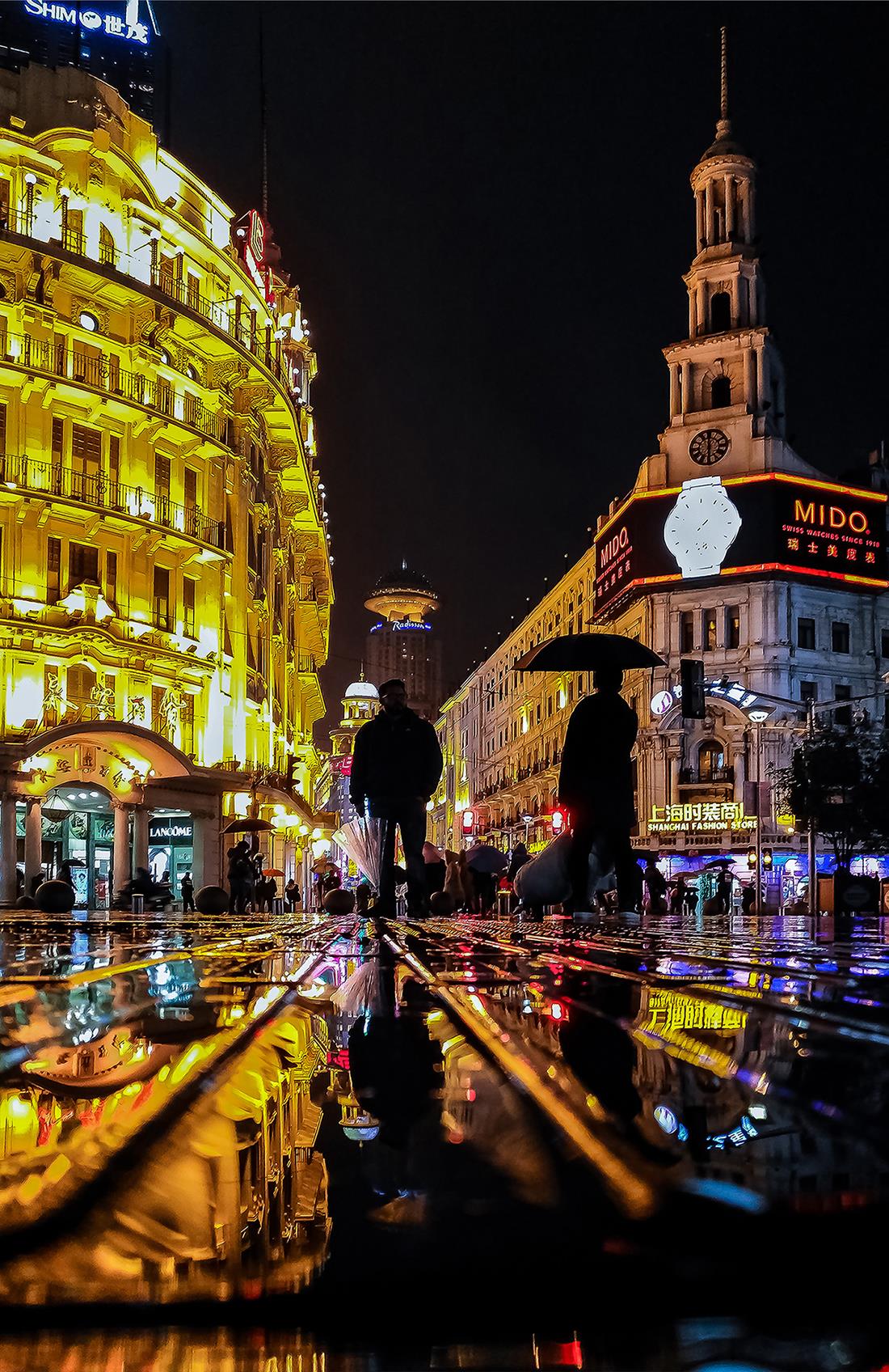 摄于上海南京东路雨夜。南京路璀璨的灯光倒映在雨后的地面上呈现出奇妙的效果。