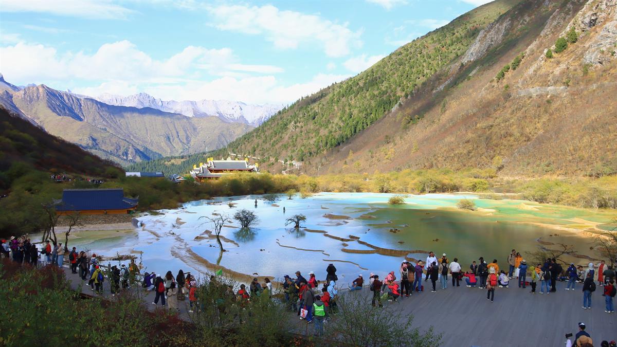 世界文化遗产黄龙的五彩池海拔3576米,面积21000平方米,拥有彩池693个,是当今世界上规模最大、彩池最多、海拔最高的露天钙华彩池群。秋季五彩池浓淡各异、色彩缤纷。