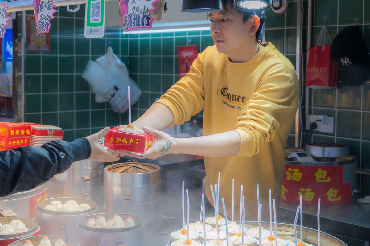 长沙黄兴广场,小吃店生意红火,小二为外地游客递上热气腾腾的特色大包子。