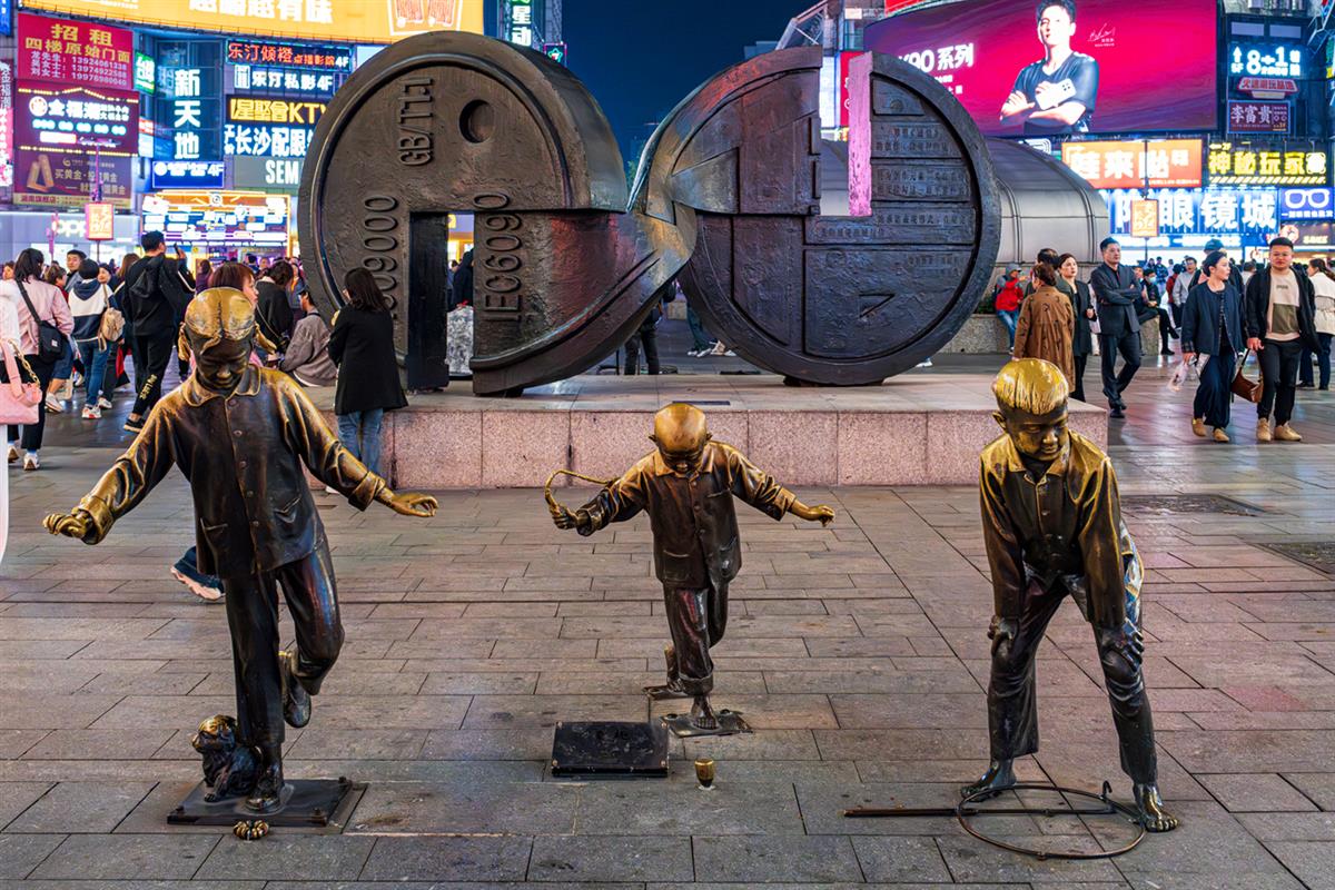 长沙黄兴步行街,铜人雕塑打陀螺格外醒目,童趣满满童真满满。