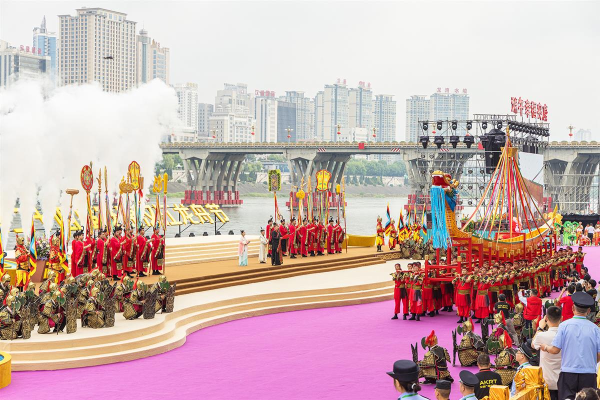 拍摄于2024年6月9日,陕西省安康市。2024年安康汉江龙舟节启动仪式,以“奋楫扬帆前行 端午幸福安康”为主题,保留着传统缅怀先贤、龙舟祭祀、龙舟竞渡等民俗活动,使成为安康重要的品牌活动。