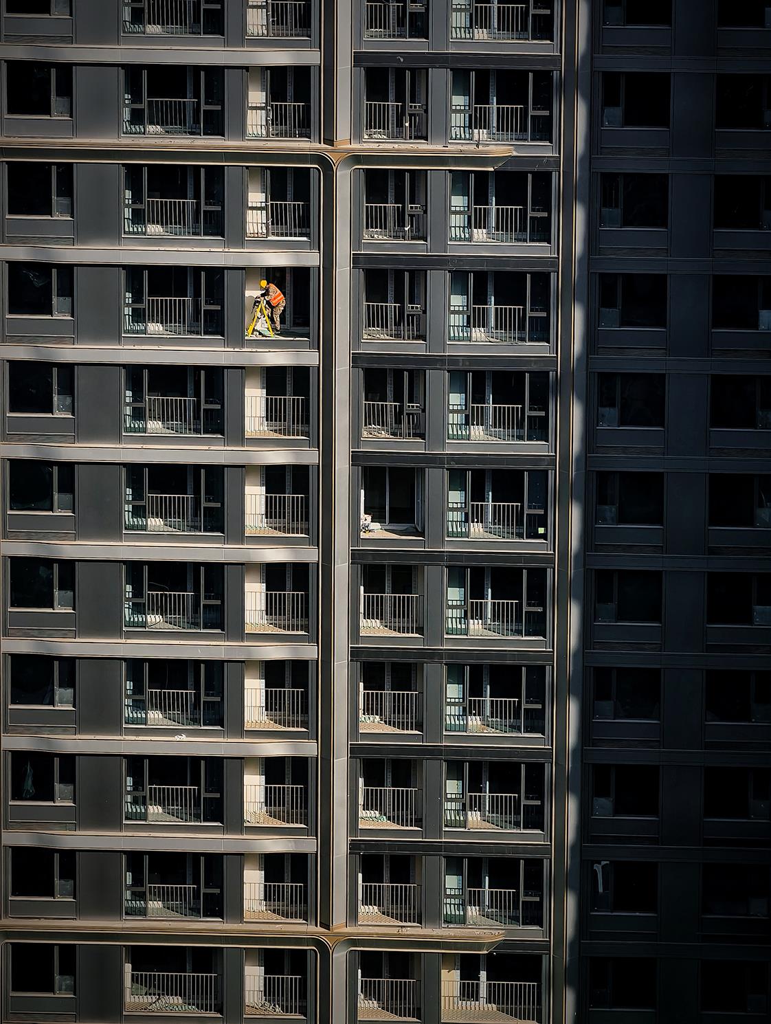 四周太齐整了——窗格成阵,钢骨如林,冷灰的颜色漫得无边无际,静得像一张未完成的图纸。而他穿着橙色工装,就这么闯进来,像一枚楔子,钉进这钢筋水泥的肌理里。那橙色并不烈,却足够在整片沉静里烧出一小窟窿,温温的,亮亮的,让视线有了落脚的地方。