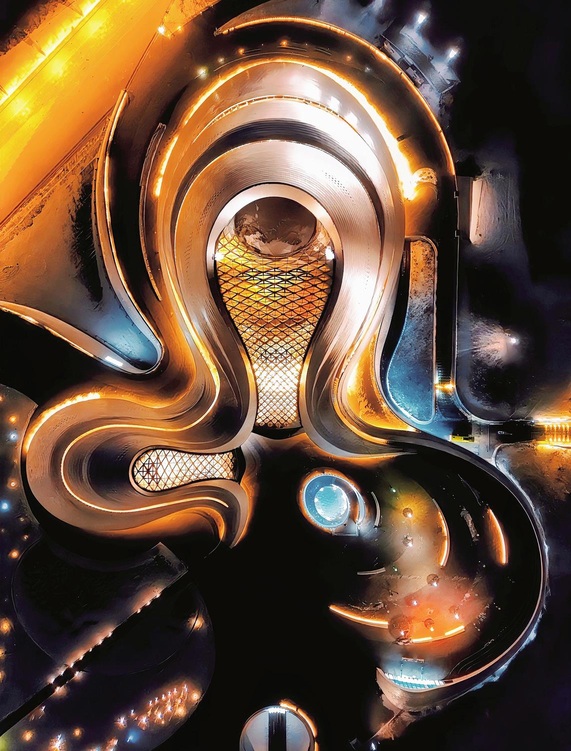 使用航拍呈现哈尔滨大剧院犹如天外来客一般的视角。