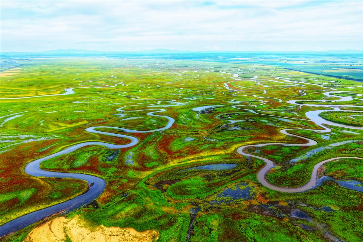 作品拍摄于双鸭山市饶河县挠力河国家湿地保护区,使用广角航拍拍摄呈现挠力河湿地之美。