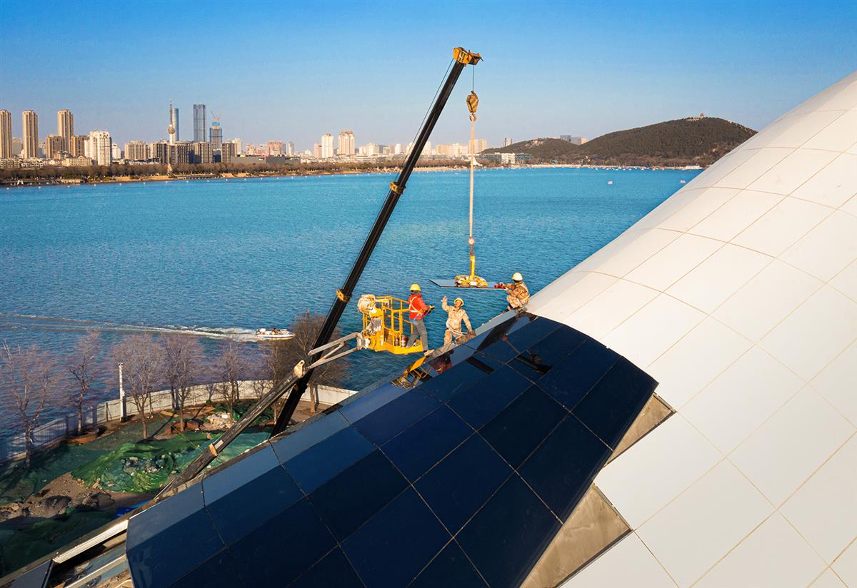 云龙湖景区水上世界进行升级改造,工人们对外立面进行安装。