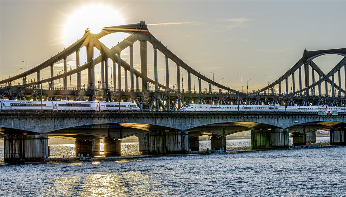 25年8月28日在杭州市九堡大桥旁拍摄到二列和谐号列车南北向交汇的场景。