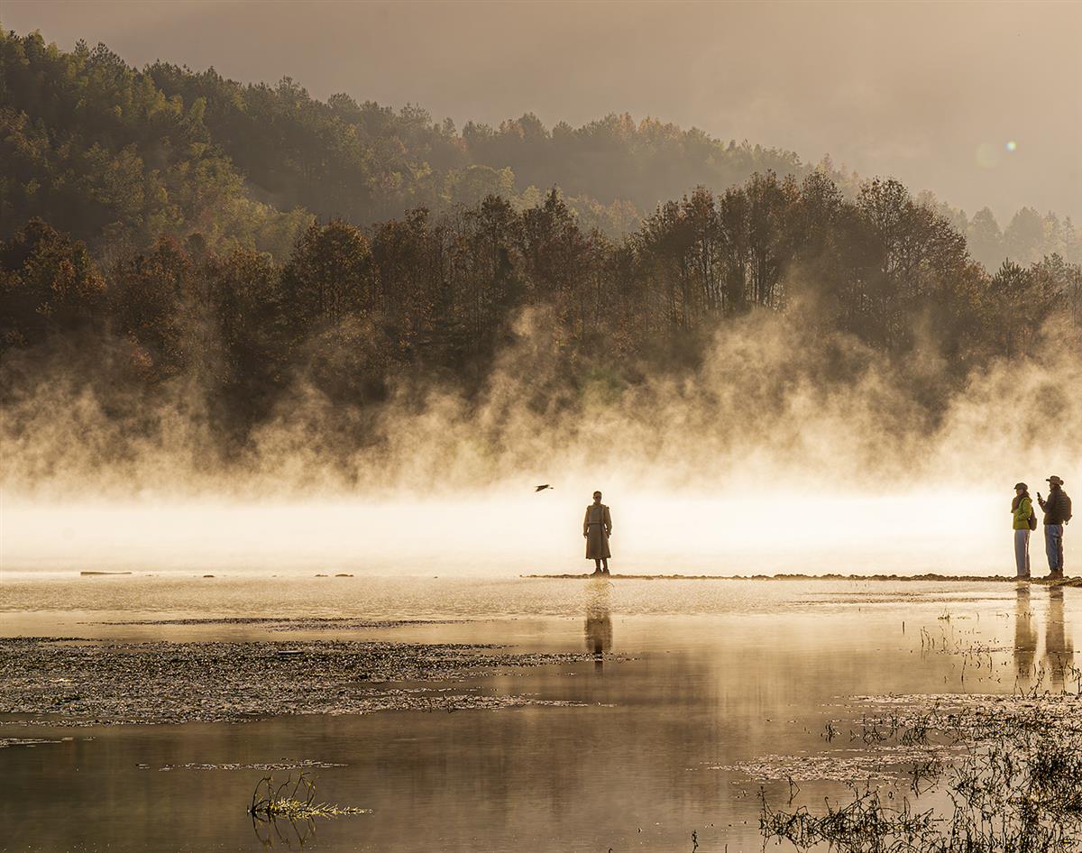25年11月26日在安徽黄山宏村奇墅湖,清晨水雾缭绕的壮观景象,迎来游客进入湖面体验,被美景吸引久久不舍得离去。