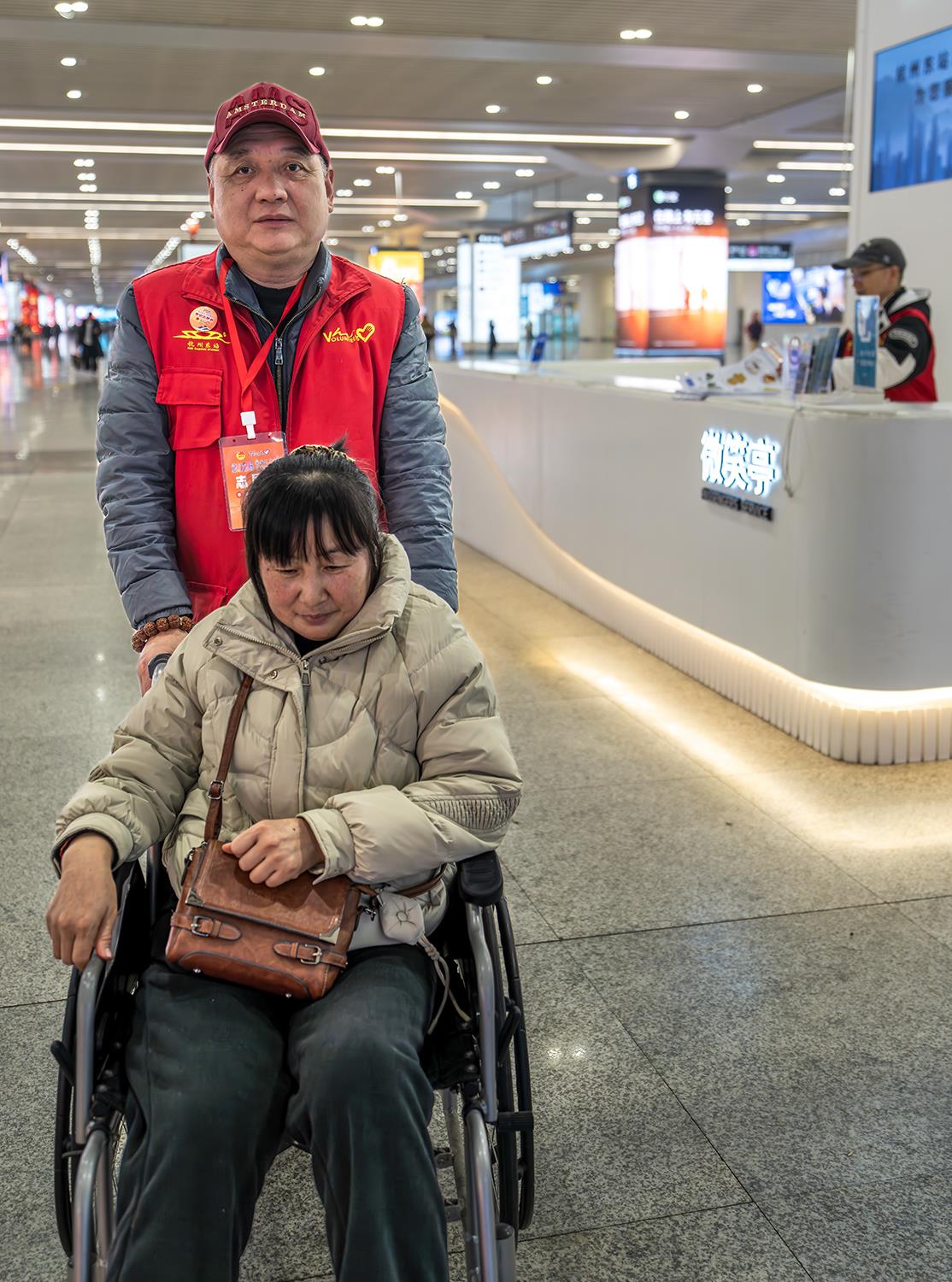 志愿者红马甲跃动如焰,微笑亭前春意融融。推车送人,寒风中一站就是一晌,心却被焐得滚烫。
