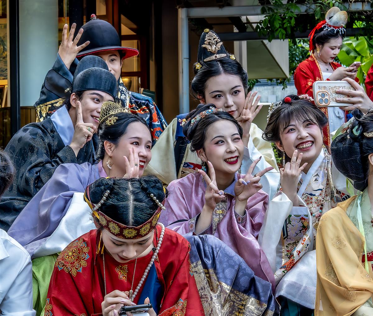 在杭州中国丝绸博物馆的汉服节上,汉服爱好者们聚在一起拍照留念。像把唐宋的月光、明清的花影都团在一起,笑闹声里,连空气都浸着点古雅的香。